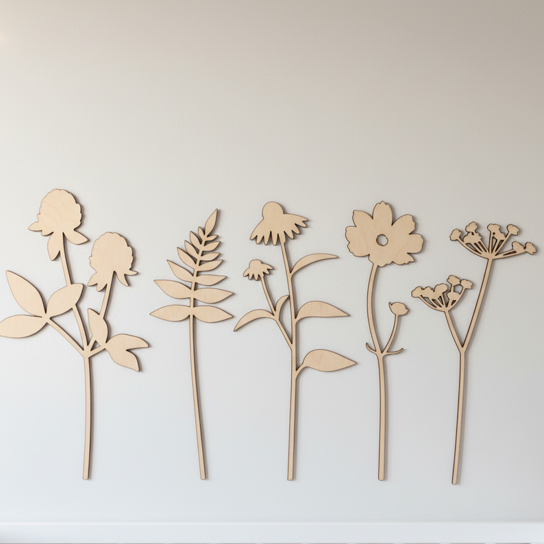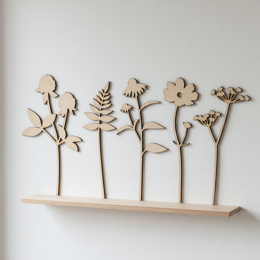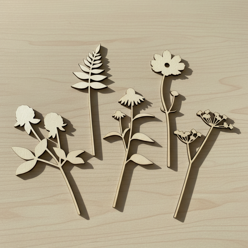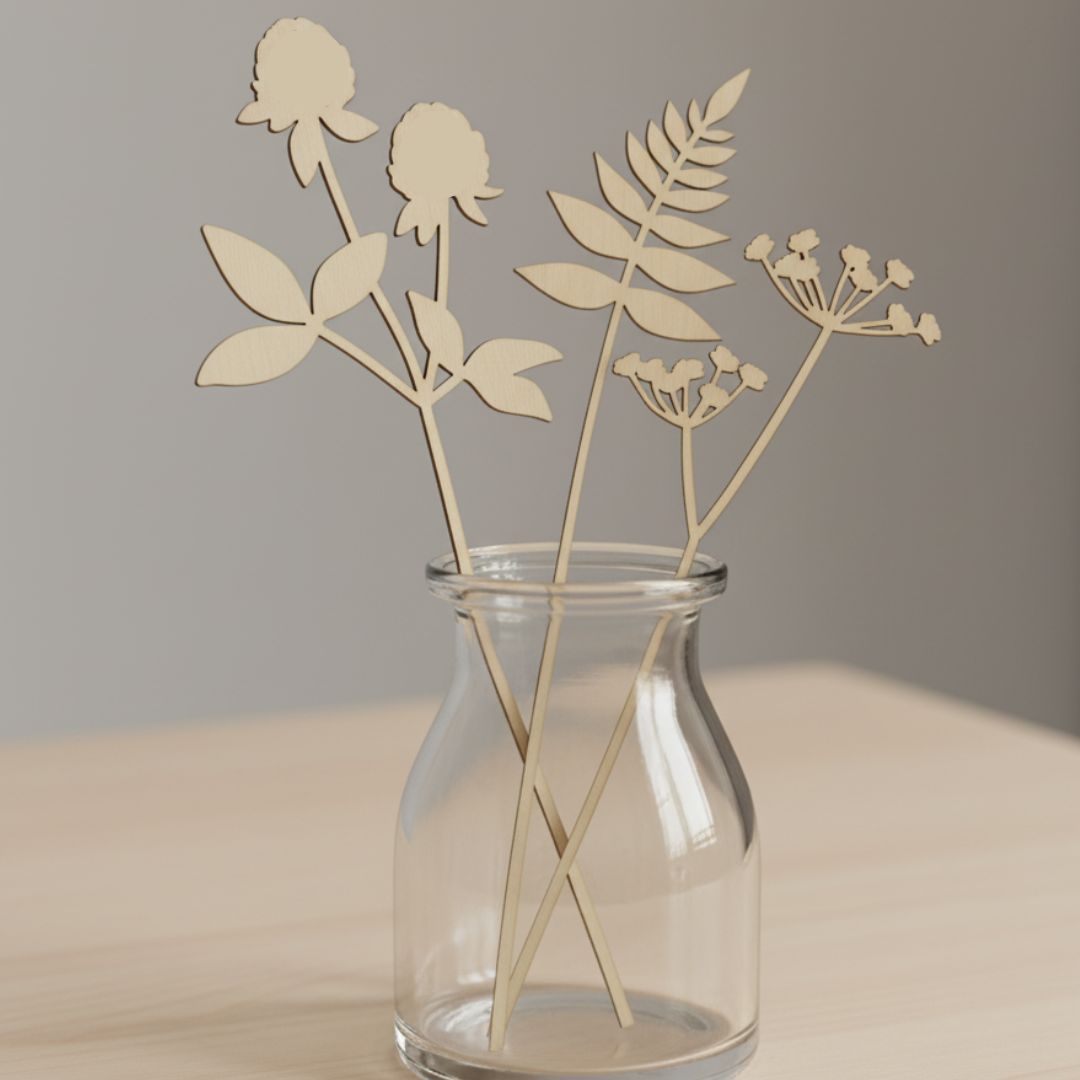 Pět různých květin vyřezaných z březové překližky působí lehce a elegantně – jako minimalistická luční kytice, která nikdy neuvadne.