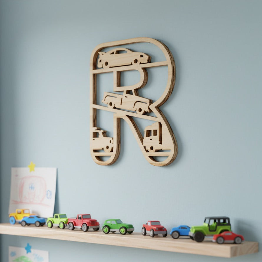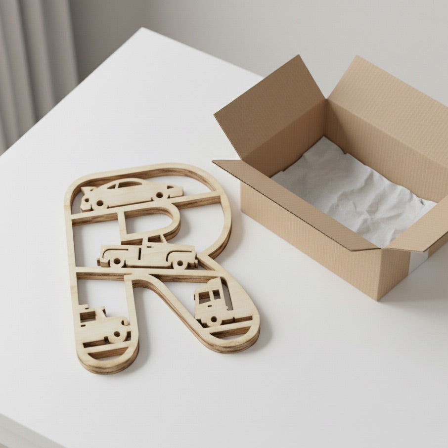 Každé písmeno je vyřezané z kvalitní březové překližky (3 mm) a zdobené motivy aut, silnic a dopravních značek. Výsledek působí hravě, dynamicky a promění pokojíček v malé autodráhové království.