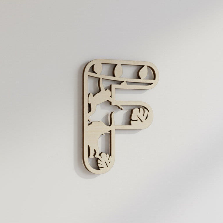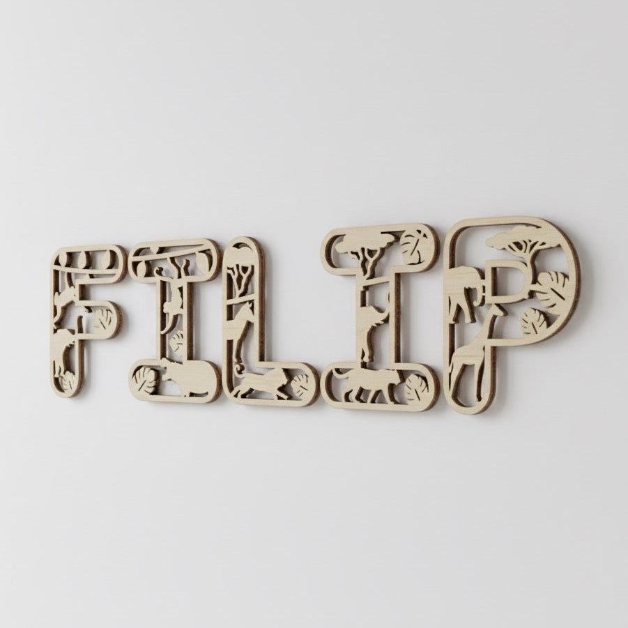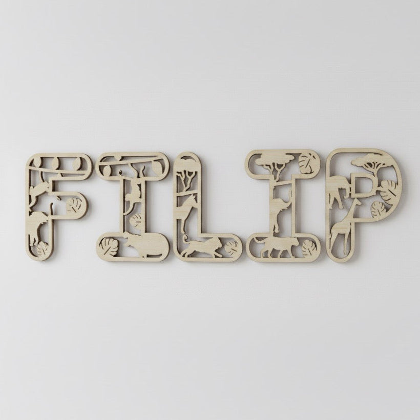 Každé písmeno je vyřezané z kvalitní březové překližky (3 mm) a zdobené motivem zvířat ze safari – např. lvy, žirafami, slony, antilopami i stromy savany.