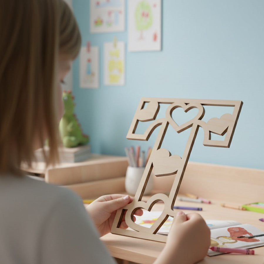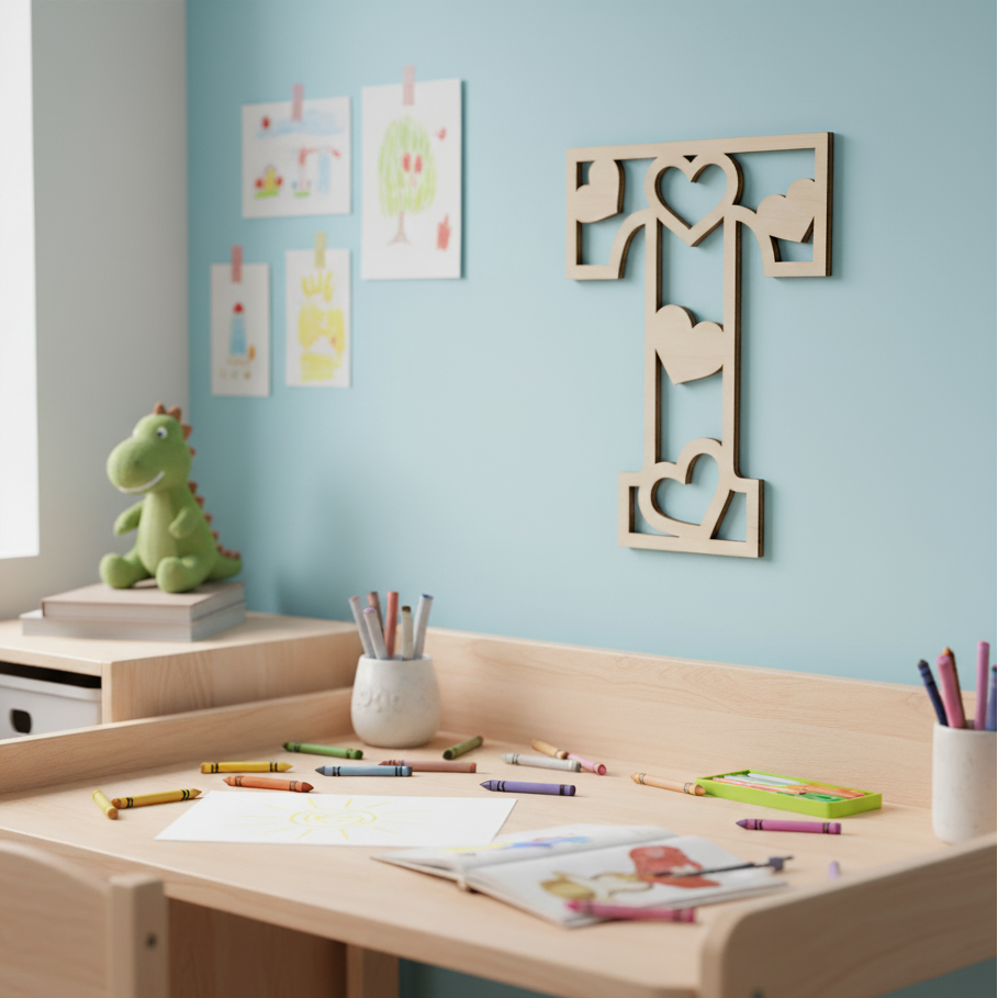 Každé písmeno je vyřezané z kvalitní březové překližky (3 mm) a zdobené různě velkými srdíčky, které symbolizují radost, hravost a lásku. Vzniká tak něžný, ale výrazný nápis, který krásně doplní dětský pokoj, dveře i poličku.