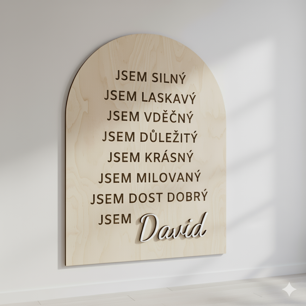 Tabulka s gravírovanými větami jako „Jsem silná. Jsem laskavá. Jsem milovaná.“ pomáhá dětem i dospělým posilovat jistotu, klid a lásku k sobě.
