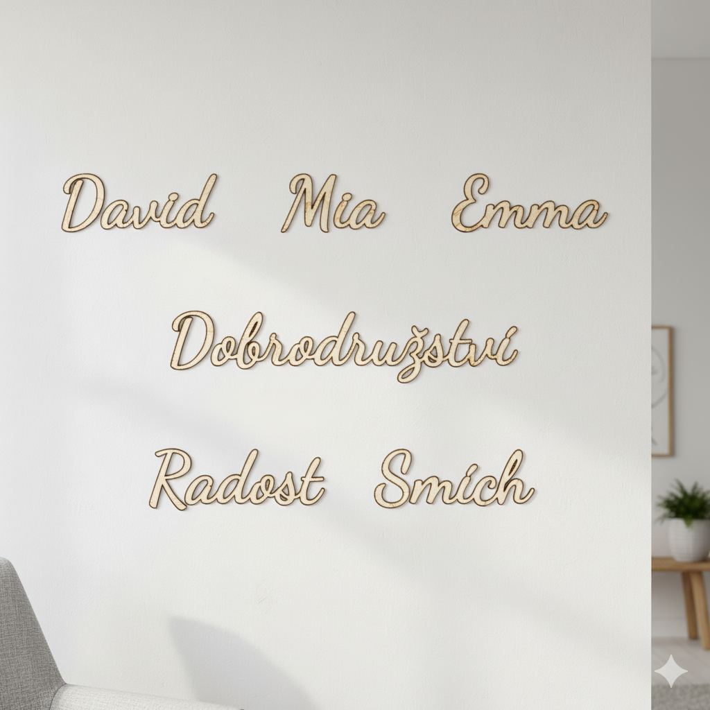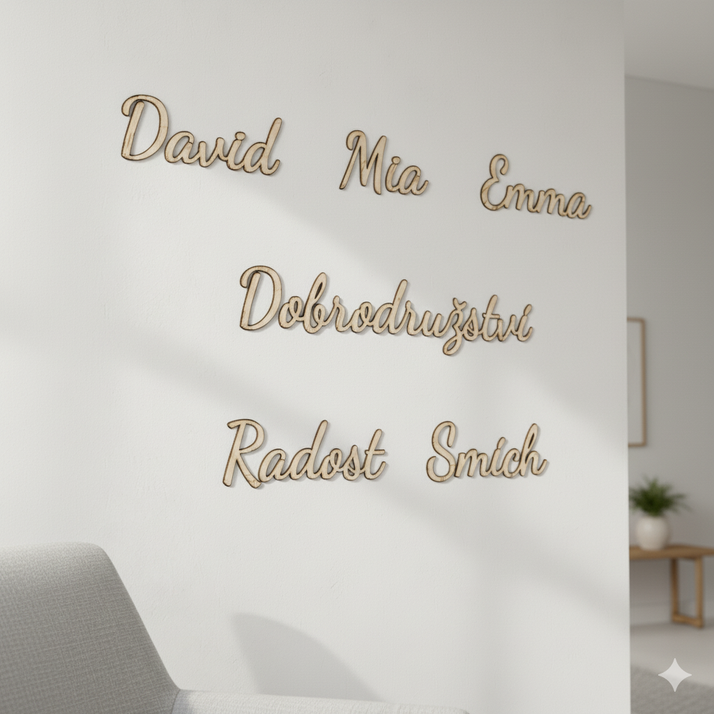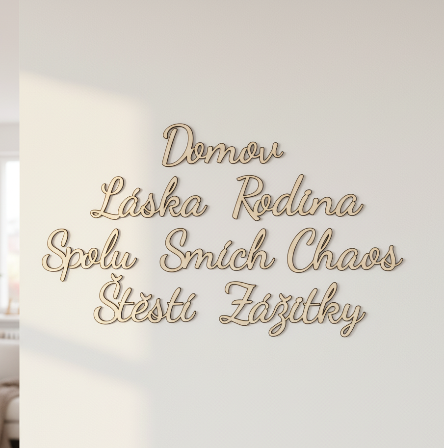 Získáte sadu dřevěných nápisů, které si jednoduše nalepíte na zeď a vytvoříte tak vlastní mozaiku z pocitů, jmen, vzpomínek nebo přání.